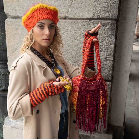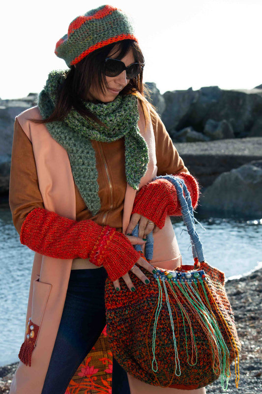 Borsa a sacca lavorata a crochet in lana arancione e verde - Crocheted tote bag in orange and green wool
