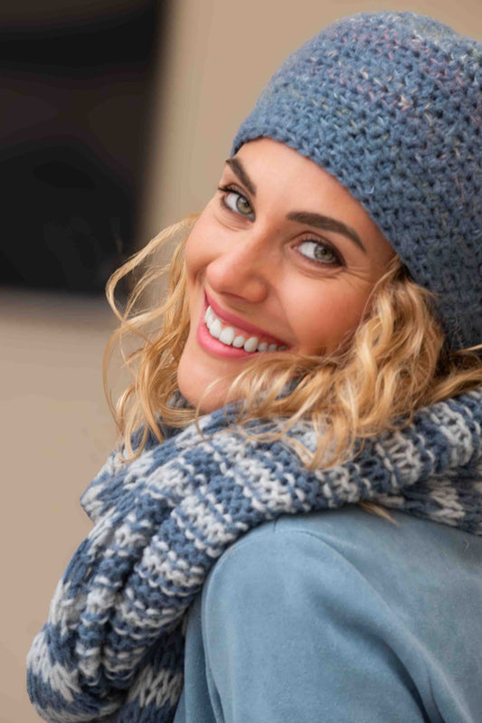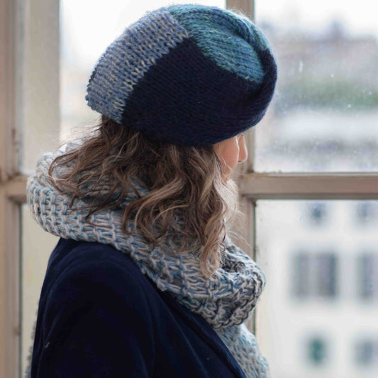 Berretto turbante in lana lavorata a tricot sui toni del blu - Woolen knitted tuban hat in shades of blue