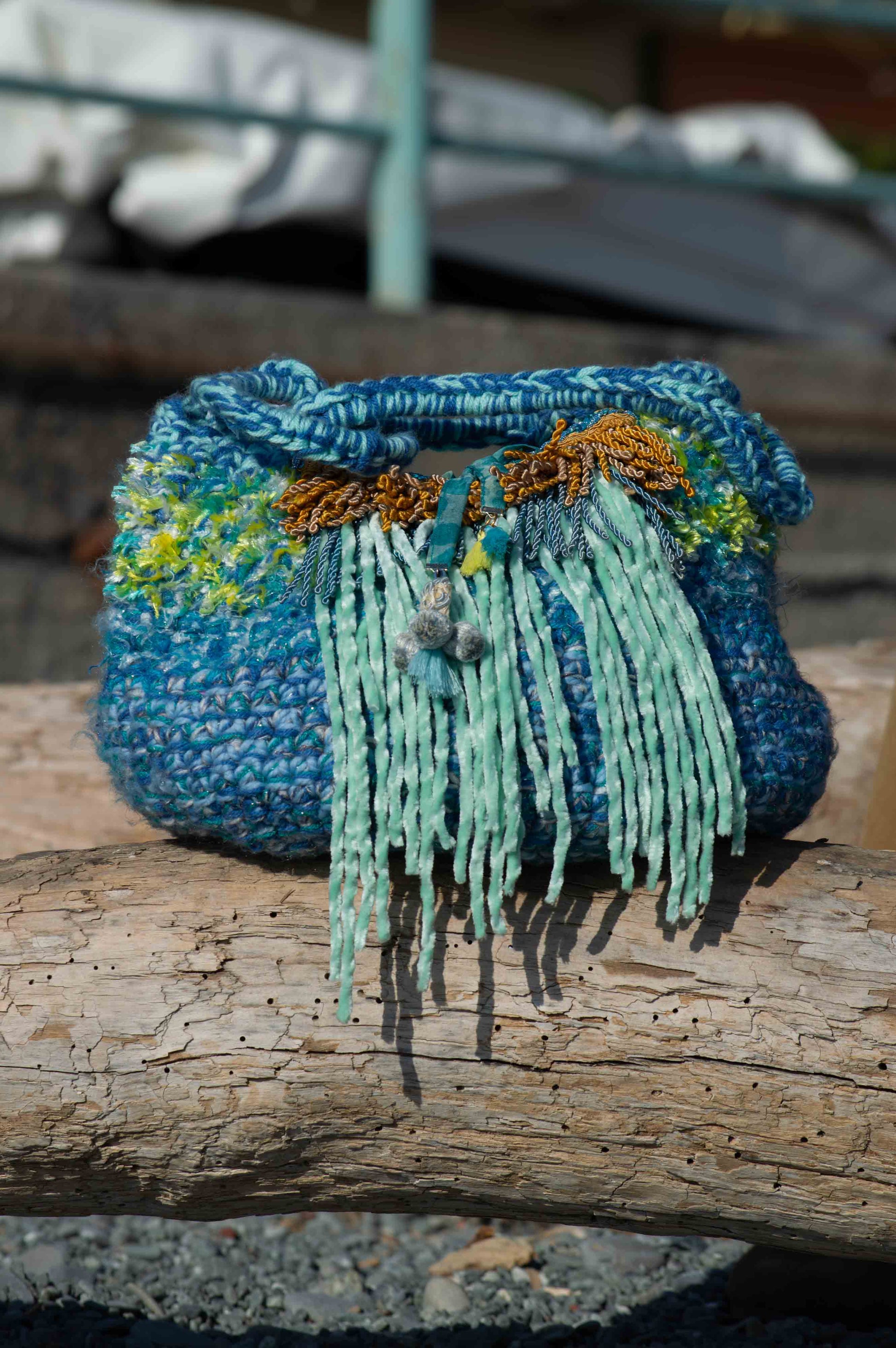 Grande borsa a sacca lavorata a crochet in lana sui toni dell'azzurro con manici a spalla e decorata con passamaneria vintage e lunghe frange in ciniglia. Pochette interna in seta. Chiusura con coulisse in seta. Pezzo unico fatto a mano.