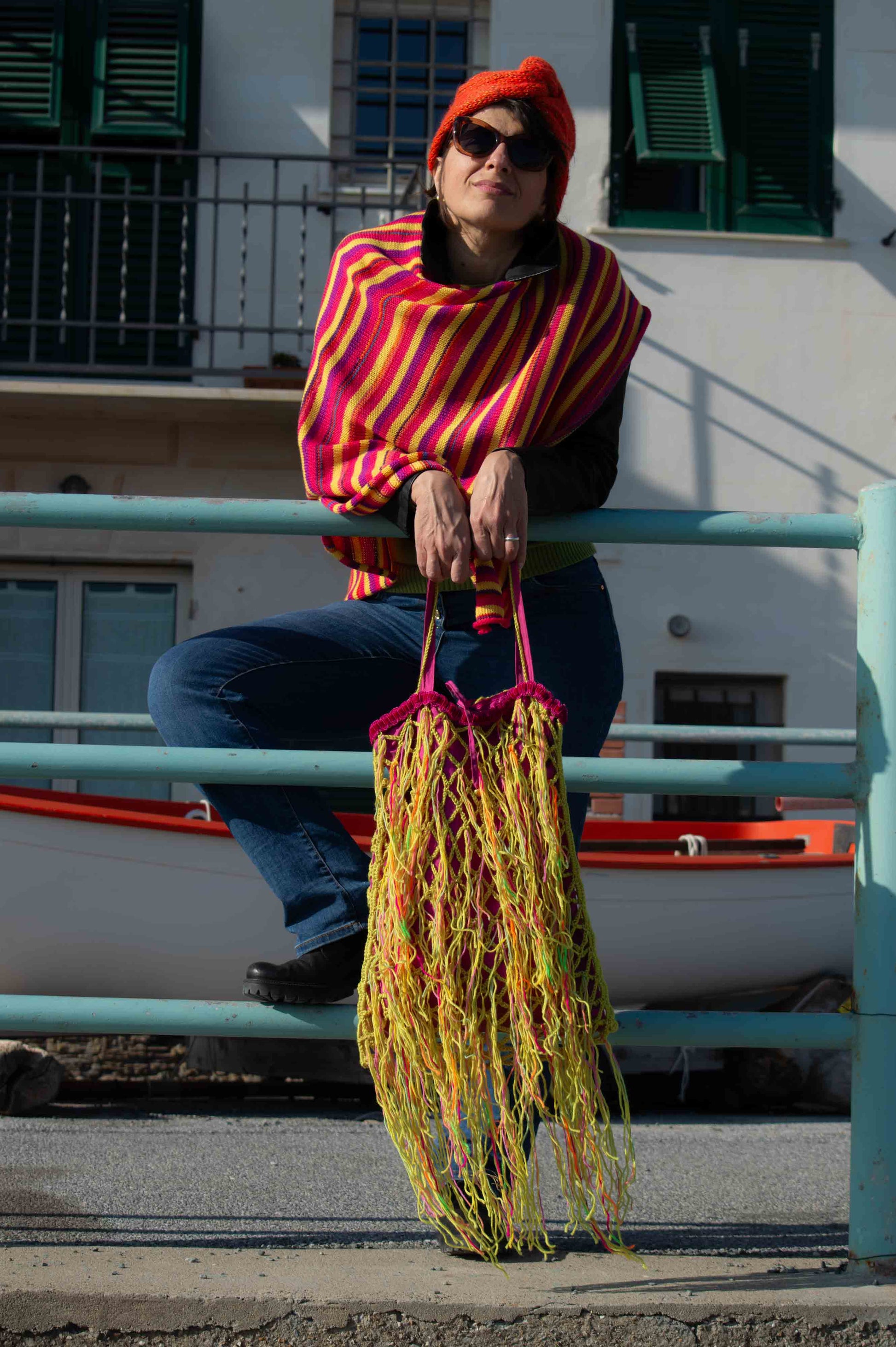 Sacca a rete giallo lime in lana lavorata a crochet, con lunghe frange, fodera doppiata in shantung di seta rosa. Tasche interne. Pezzo unico fatto a mano.