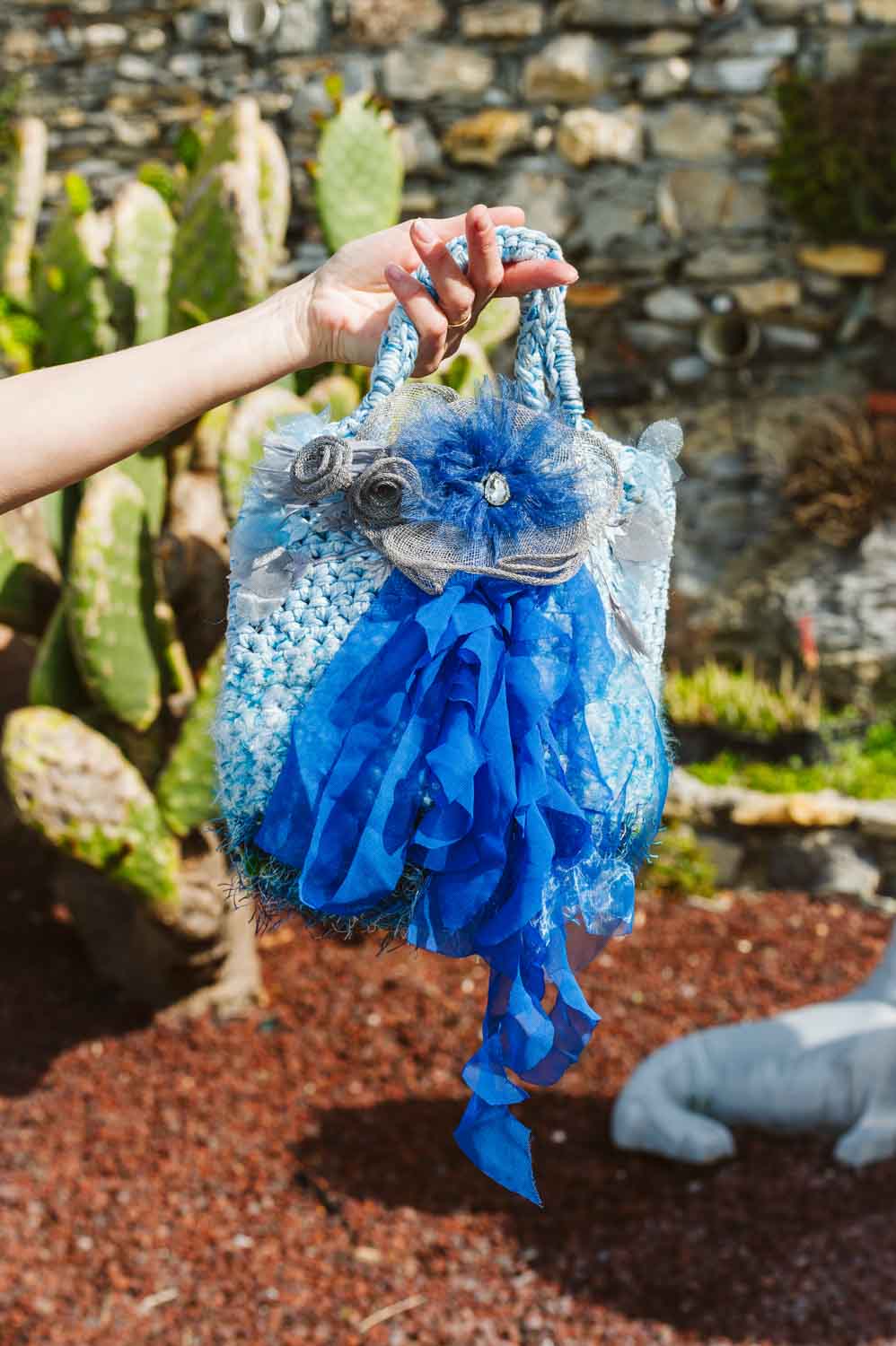 Crochet handbag in light blue tones, with georgette fringes and raffia flower. Internal clutch bag in silk shantung