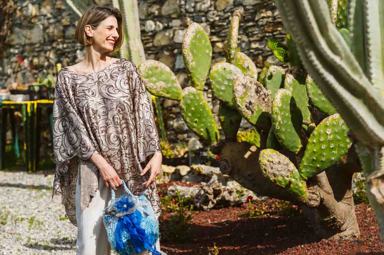 Borsa a mano lavorata a crochet sui toni celesti, con frange in georgette e fiore in rafia. Pochette interna in shantung di seta in tinta