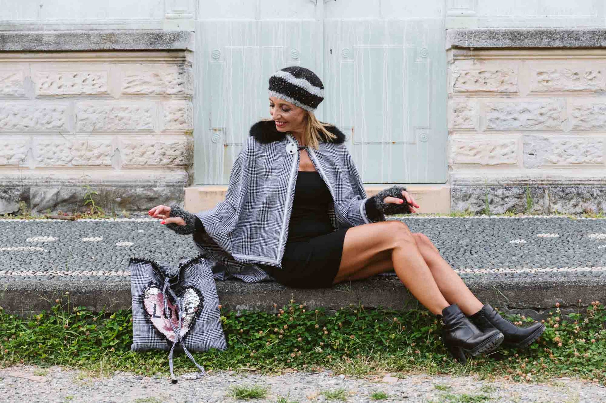 Houndstooth vintage fabric tote bag, embroidered with trimmings and a large central heart in iridescent sequins; black quilted lining, internal pockets, bow closure decorated with pendant. Unique item.