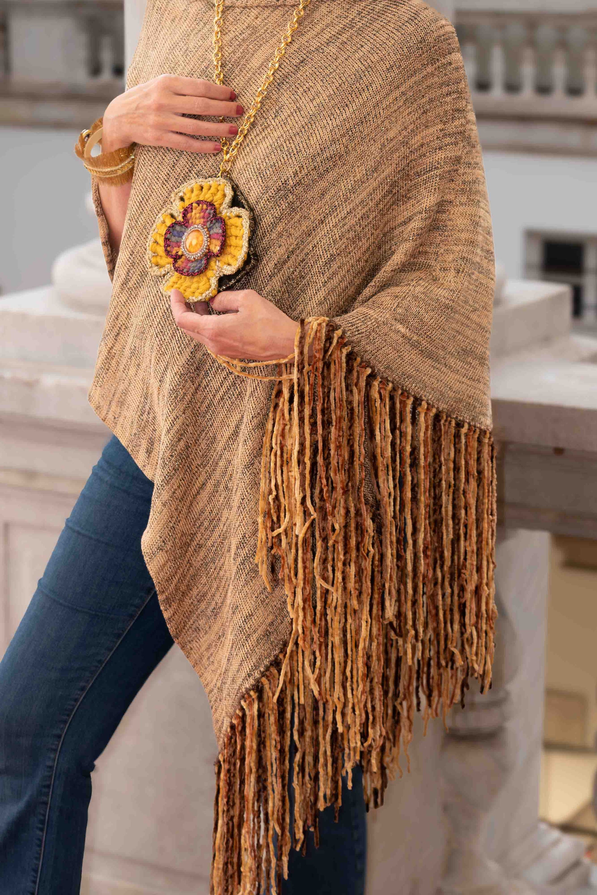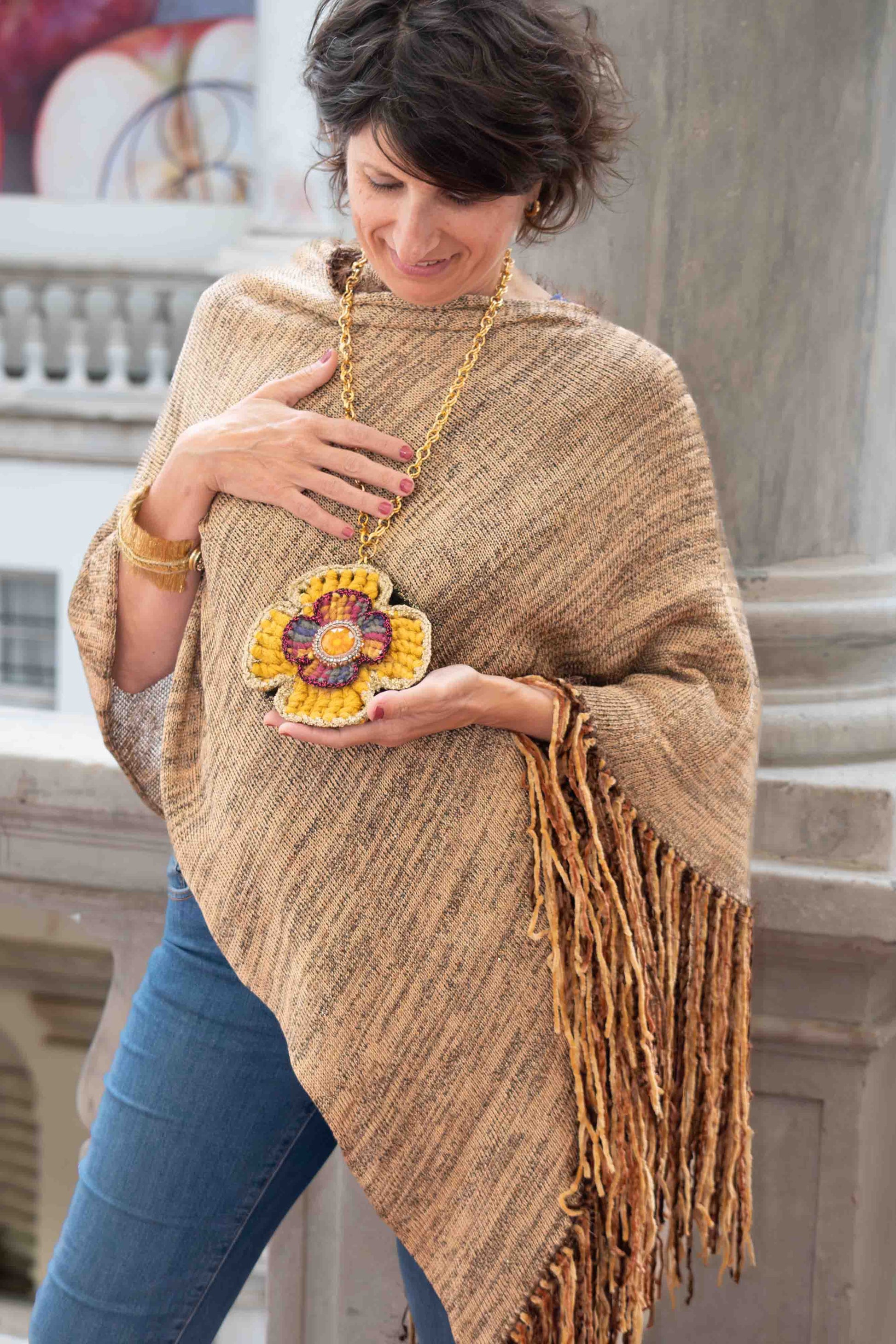 Collana con grande ciondolo formato da 3 fiori realizzati a crochet e punto luce centrale gioiello. Pezzo unico fatto a mano.