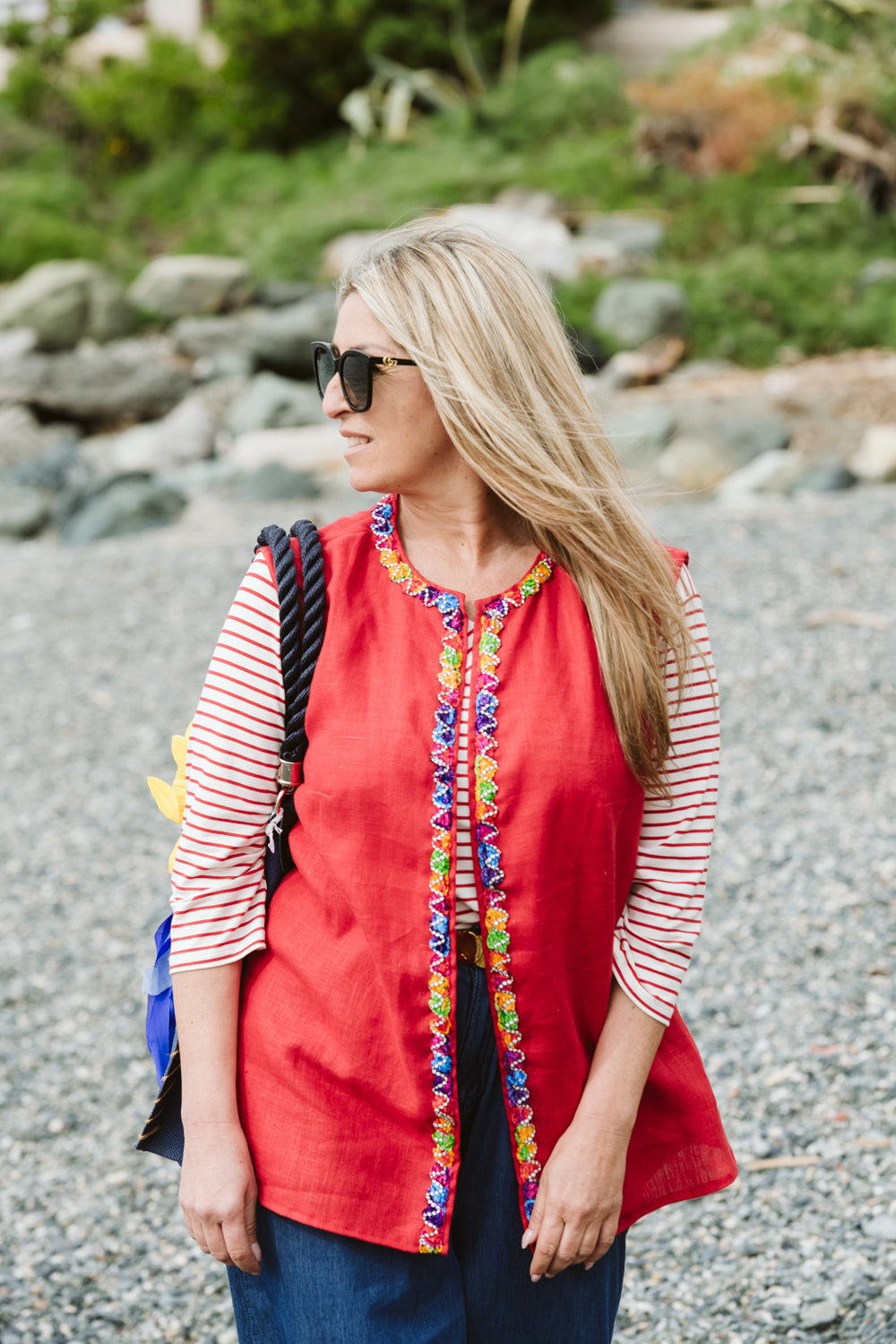 Midi lenght gilet, in red linen decorated with coloured trimming. Tailored finishing. Unique handmade item