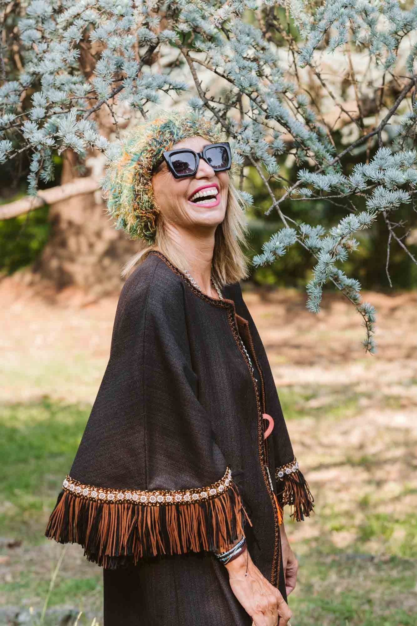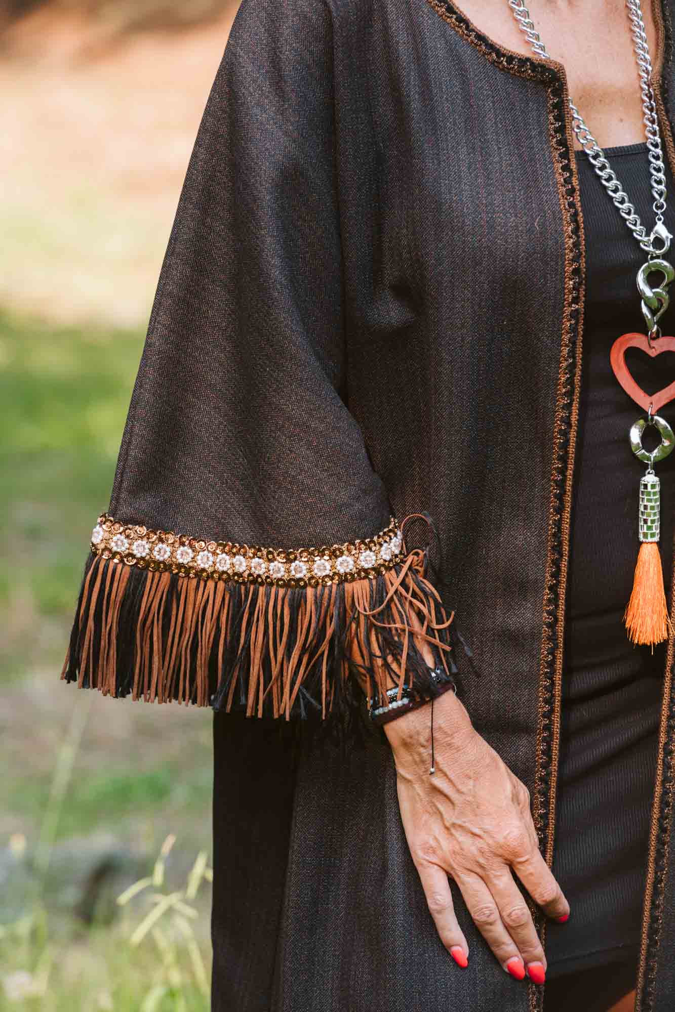 Kimono in lana vintage sui toni del nero e marrone, impreziosito con passamaneria gioiello e frange in Alcantara. Pezzo unico.