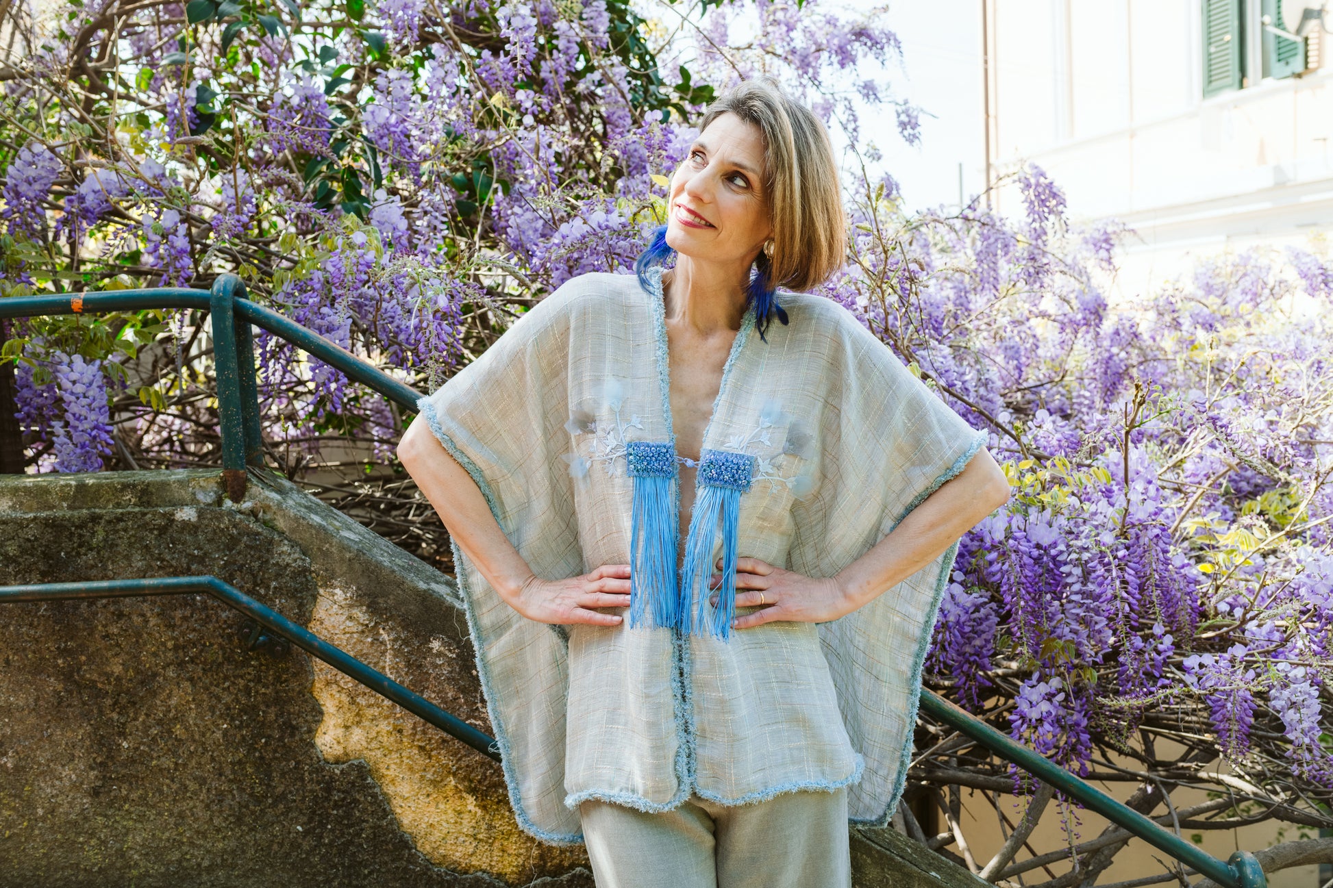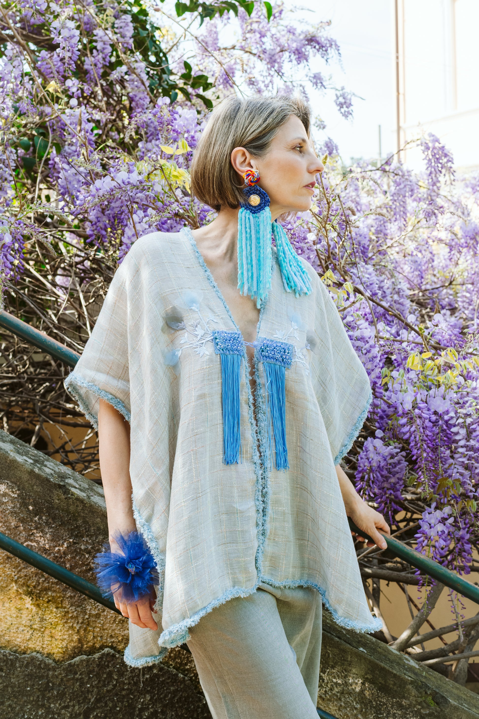 Cappa lino e lurex azzurra con chiusura gioiello, fiori e frange. Pezzo unico