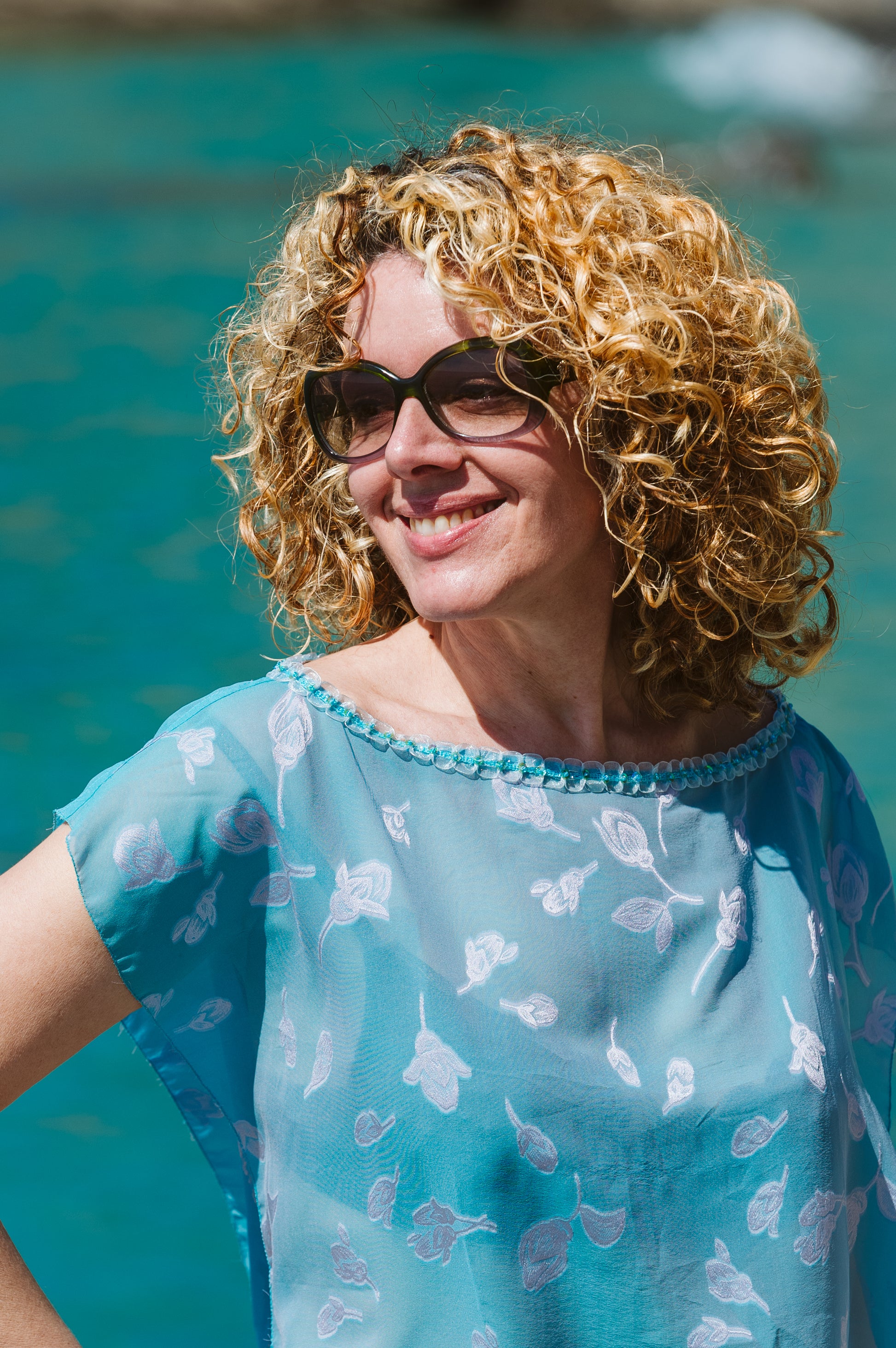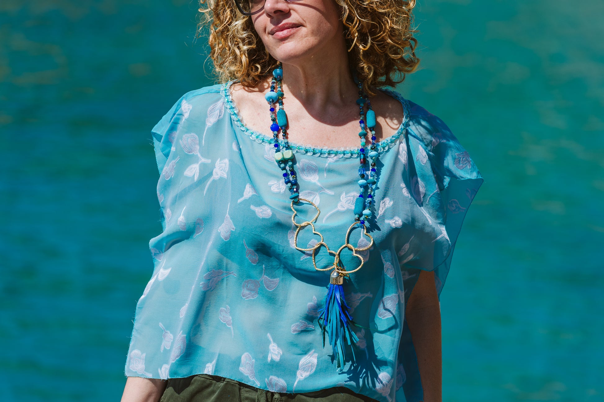 Mini poncho in georgette di seta azzurra stampata con passamaneria. Orlo sfrangiato Pezzo unico