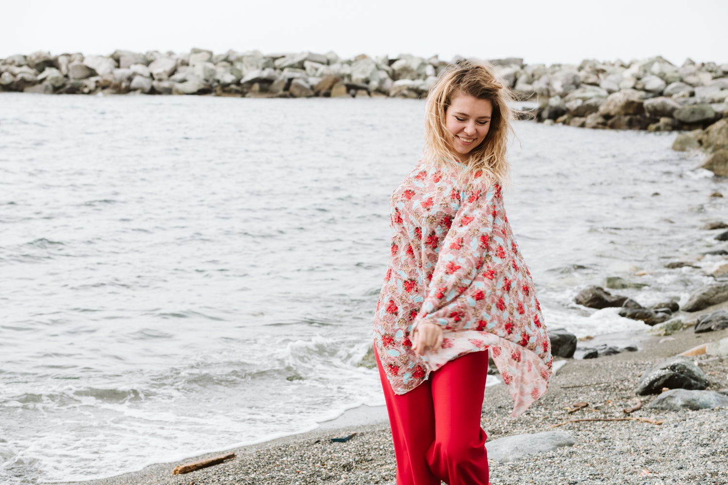 Antique pink jersey poncho with red and turquoise floral pattern in relief; tailored finishing. Unique handmade item.