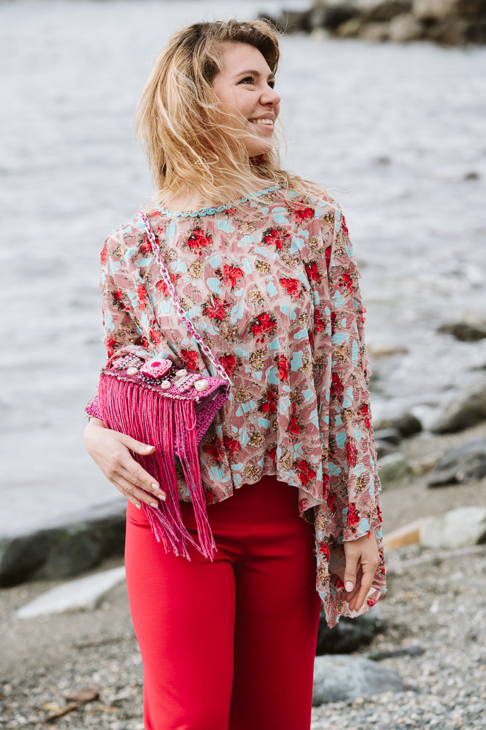Poncho in jersey color rosa antico con fantasia floreale rossa e turchese in rilievo; rifiniture sartoriali. Pezzo unico artigianale.
