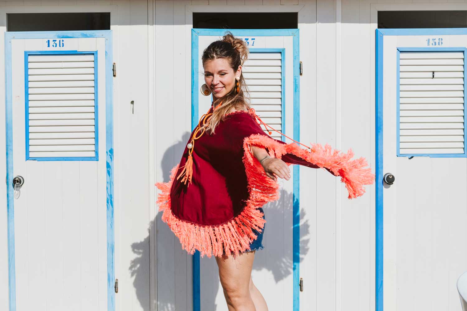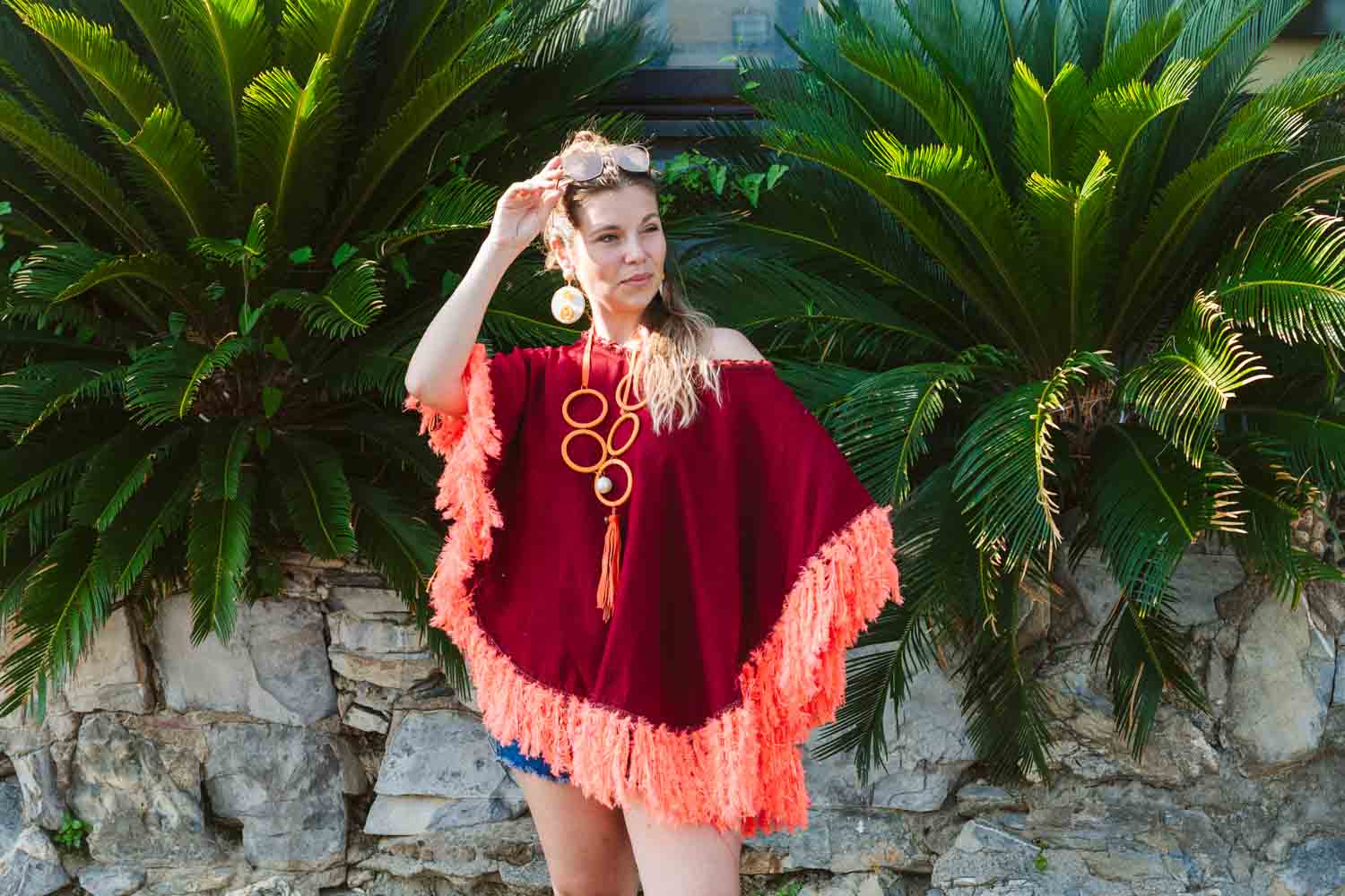 Poncho in lino bordeaux con frange e piume - Bordeaux linen poncho with fringes and feathers