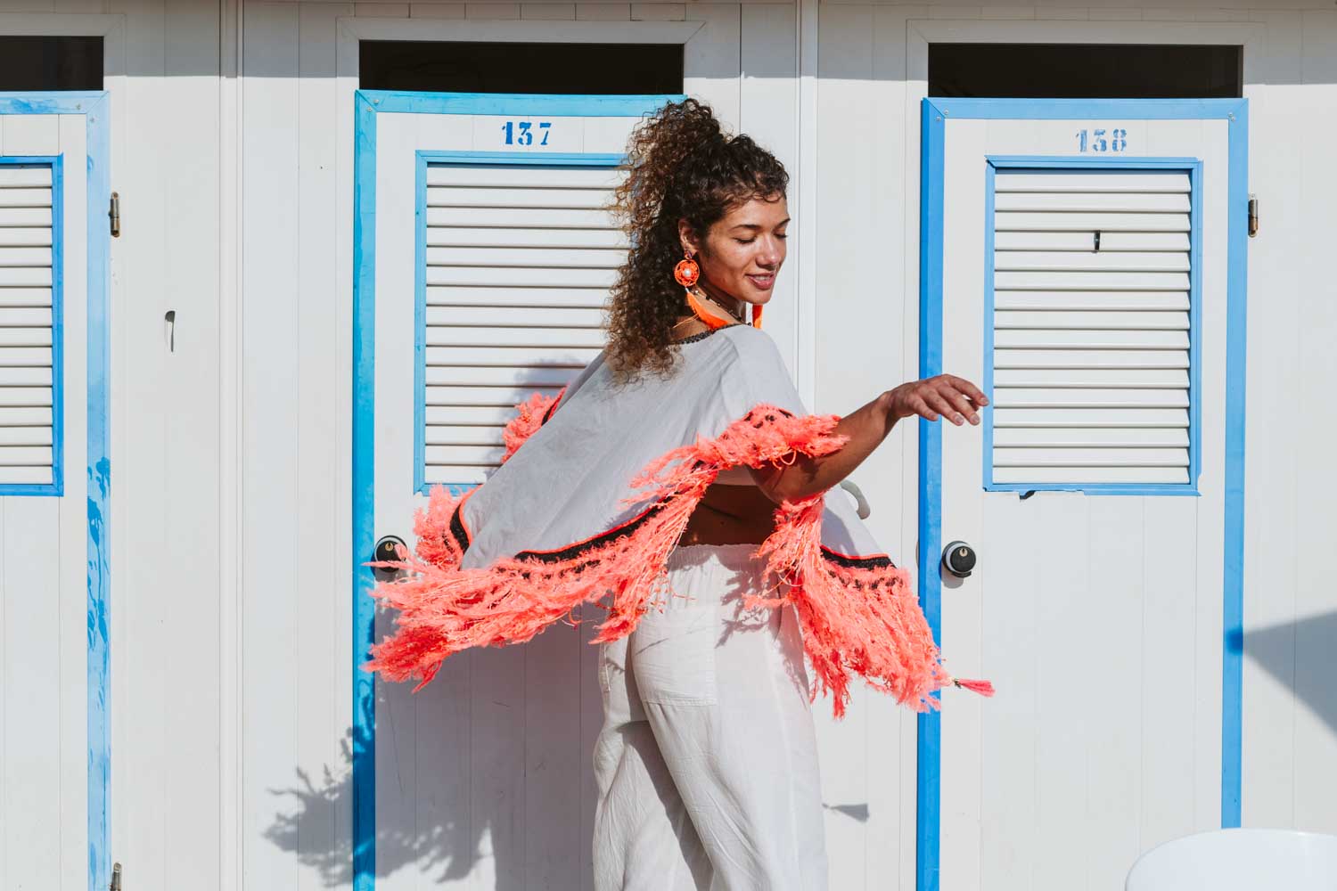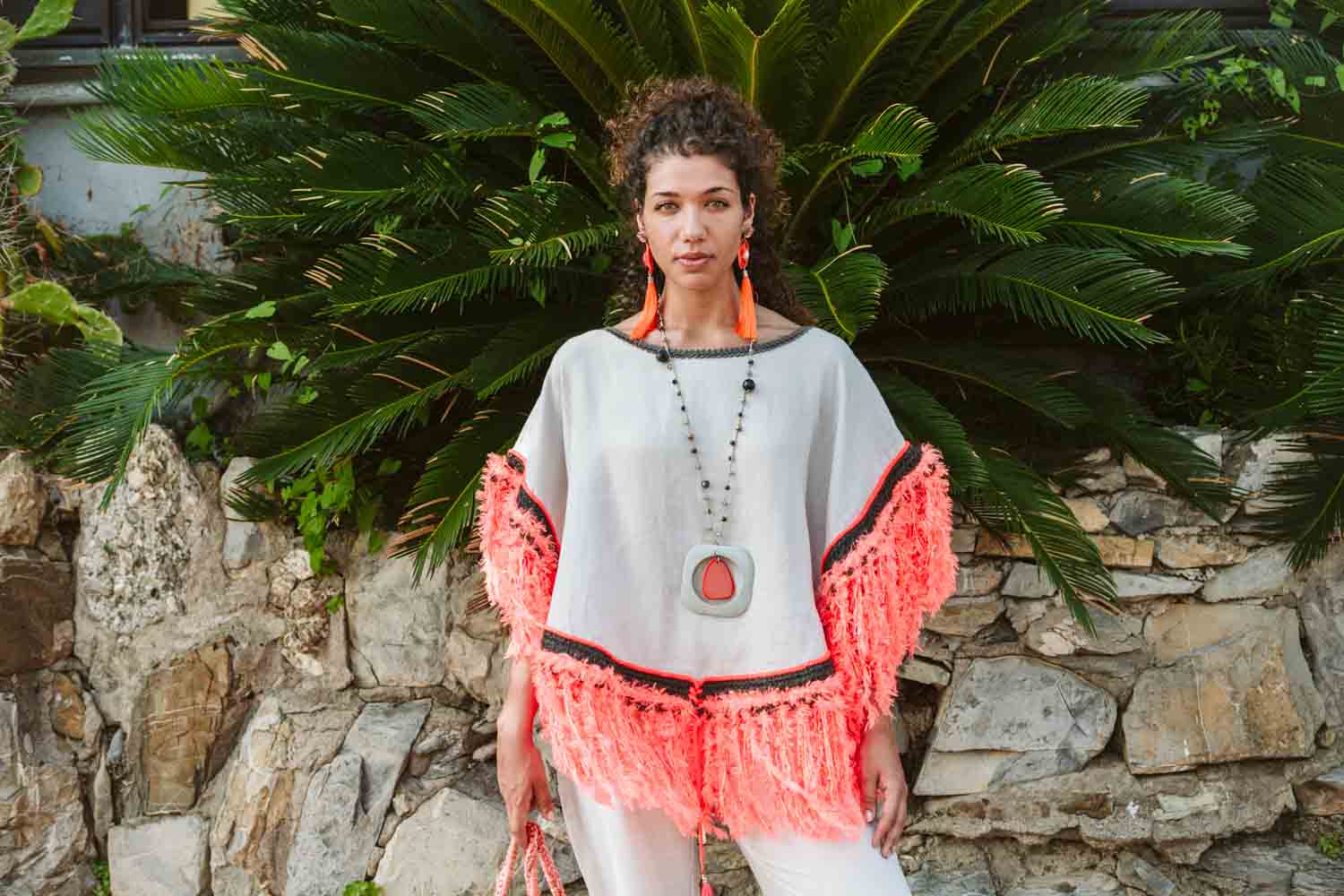 Poncho in lino grigio perla con bordo in juta lavorato a crochet e frange in filato fluo e piume. Pezzo unico.