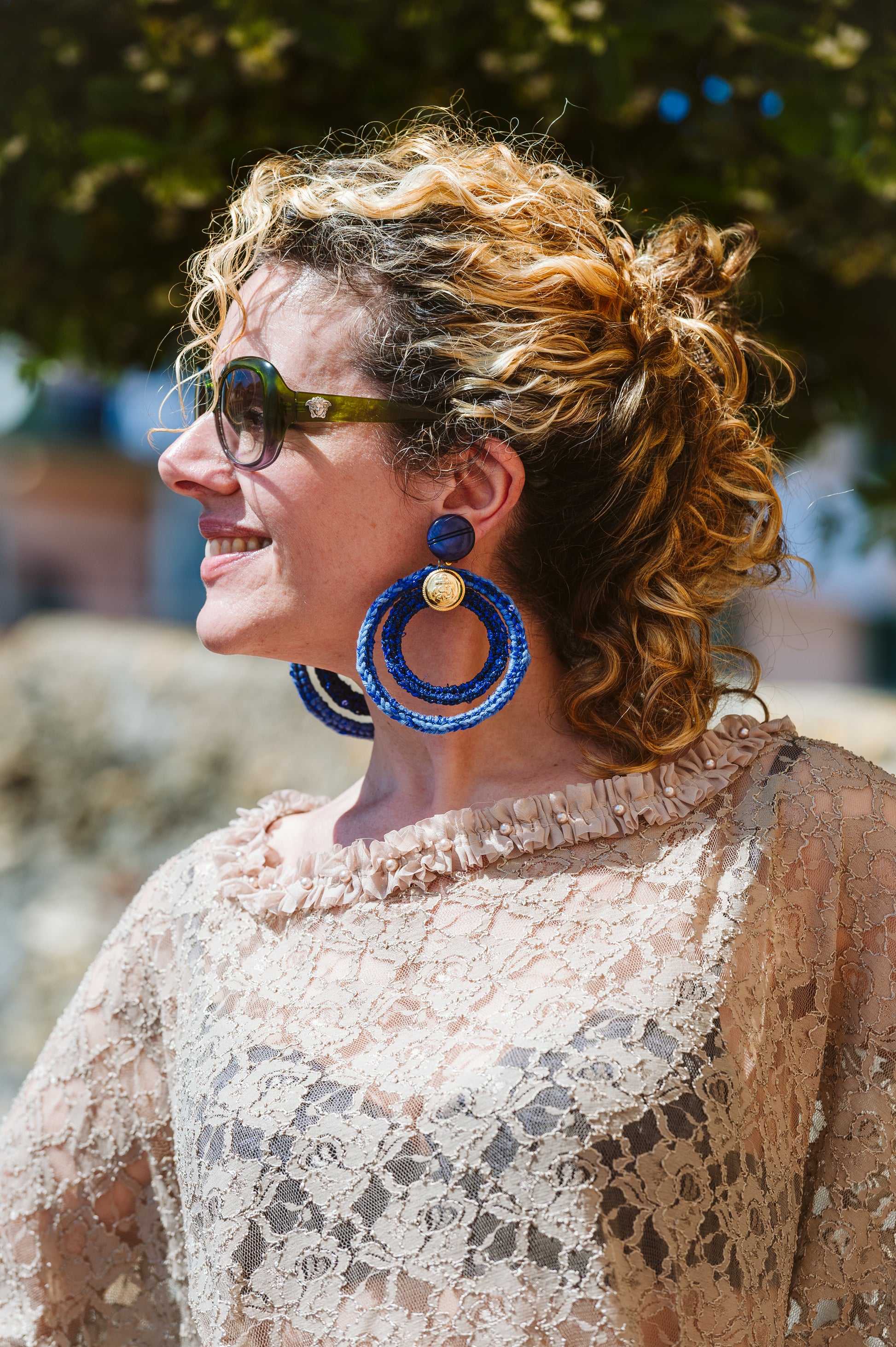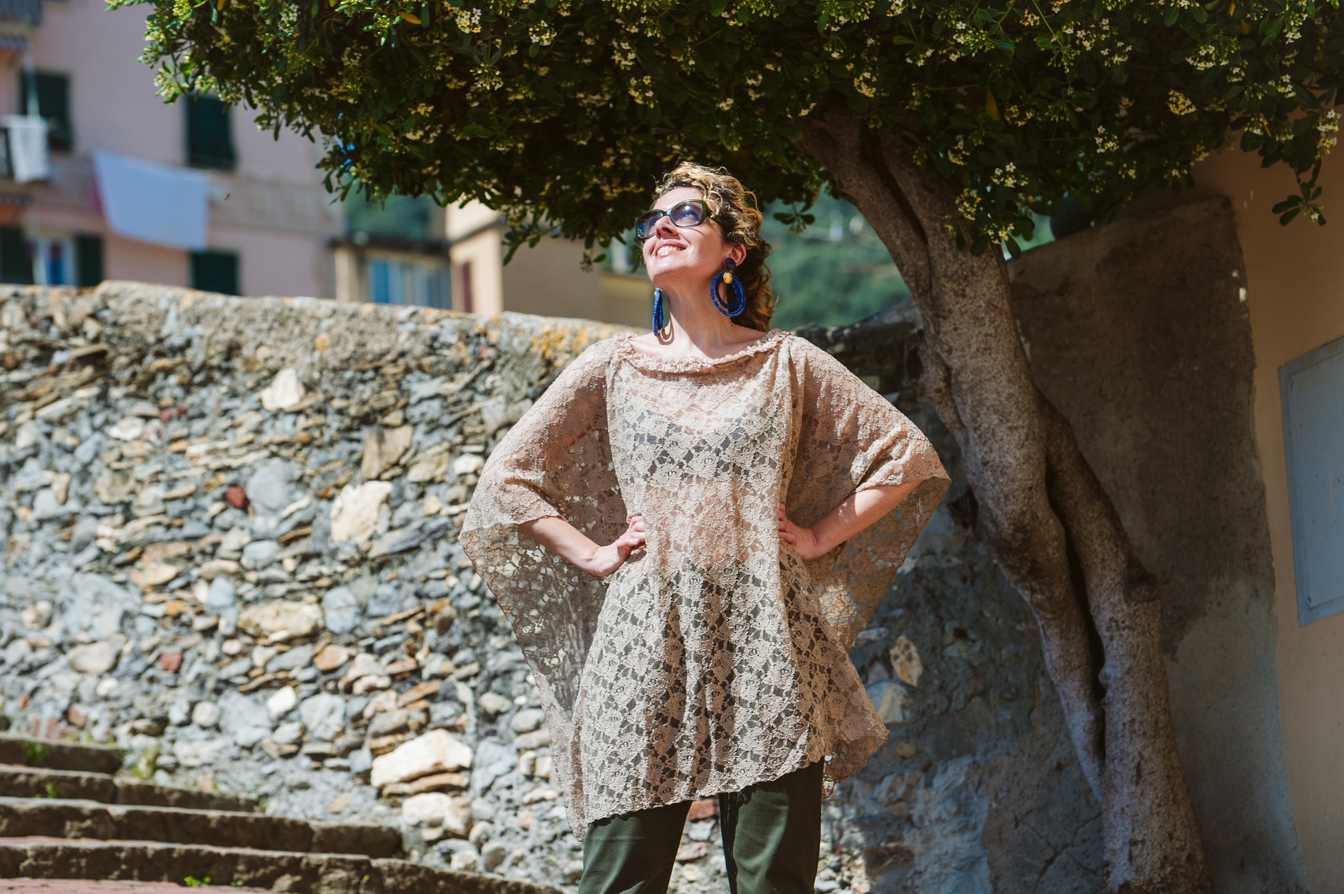 Poncho in pizzo elasticizzato beige, decorato con passamaneria floreale. Pezzo unico