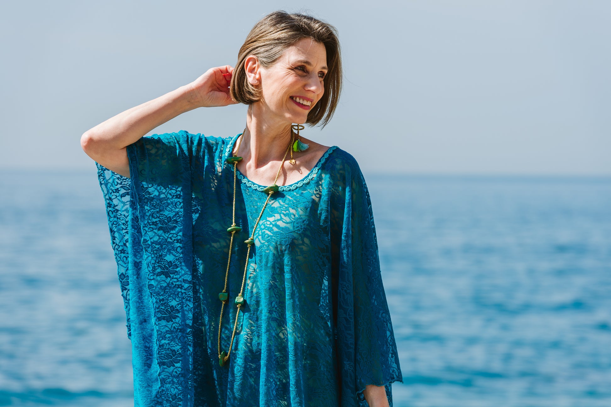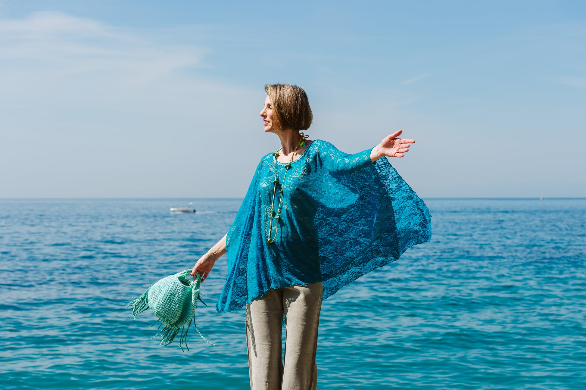 Turquoise stretch lace poncho, embellished with trimmings. Unique item.