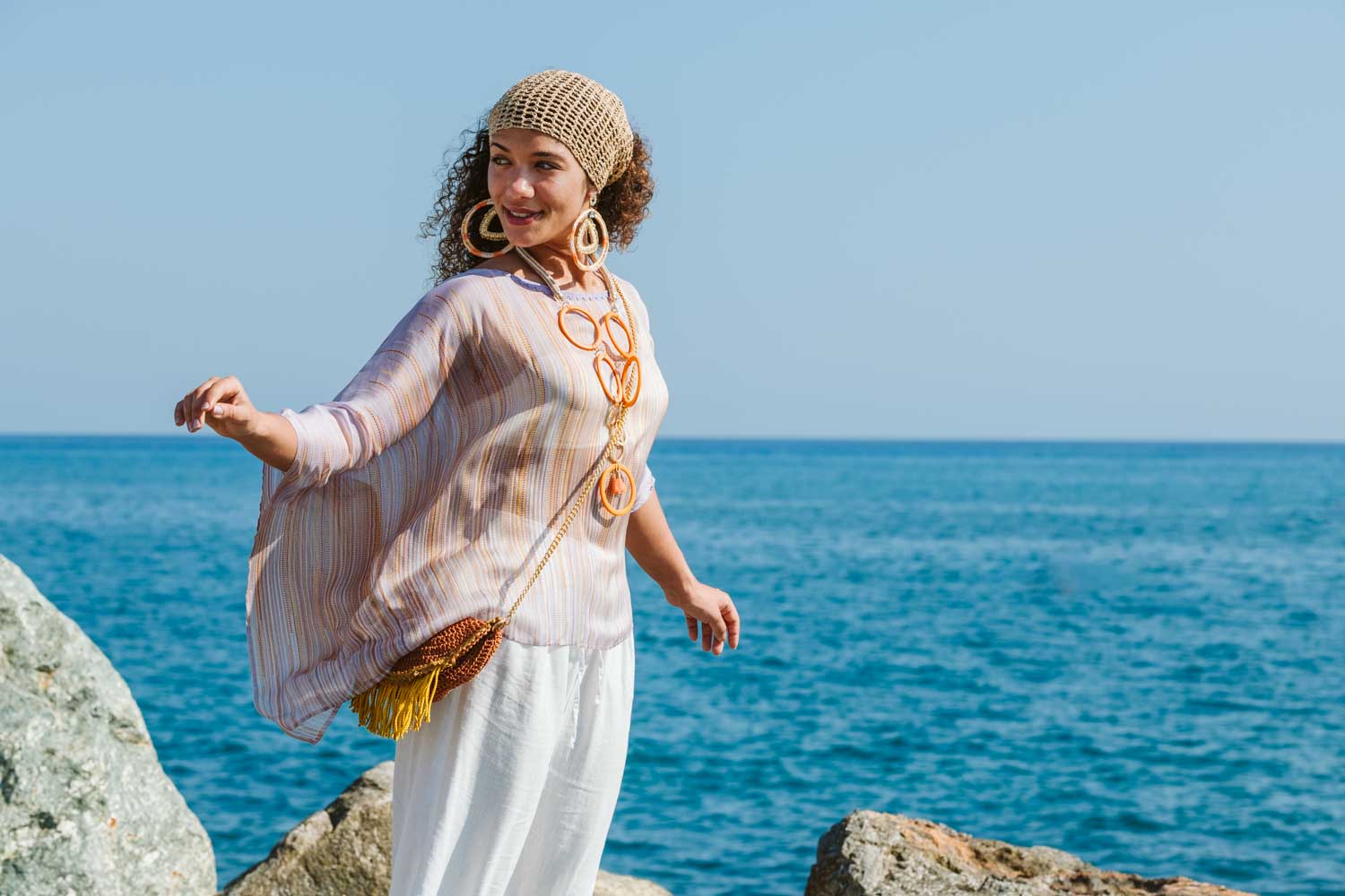 Poncho in georgette di seta di alta moda, stampata sui toni lavanda e bronzo, con passamaneria. Pezzo unico.
