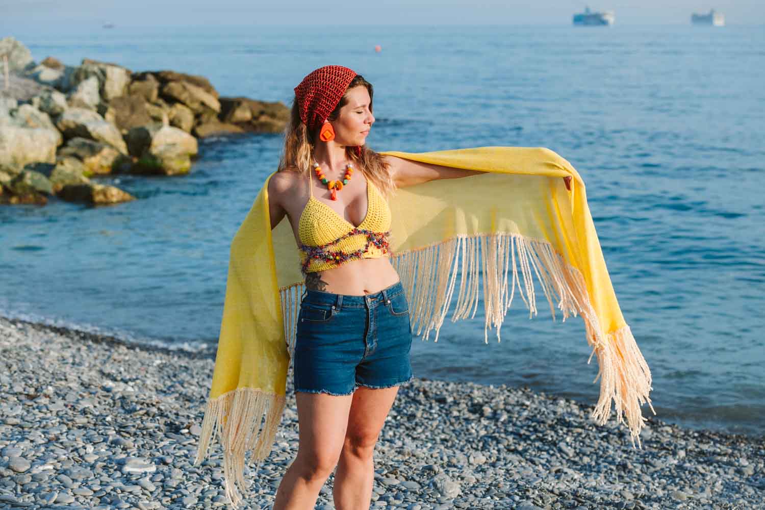Scialle in viscosa giallo con frange - Yellow viscose shawl with fringes
