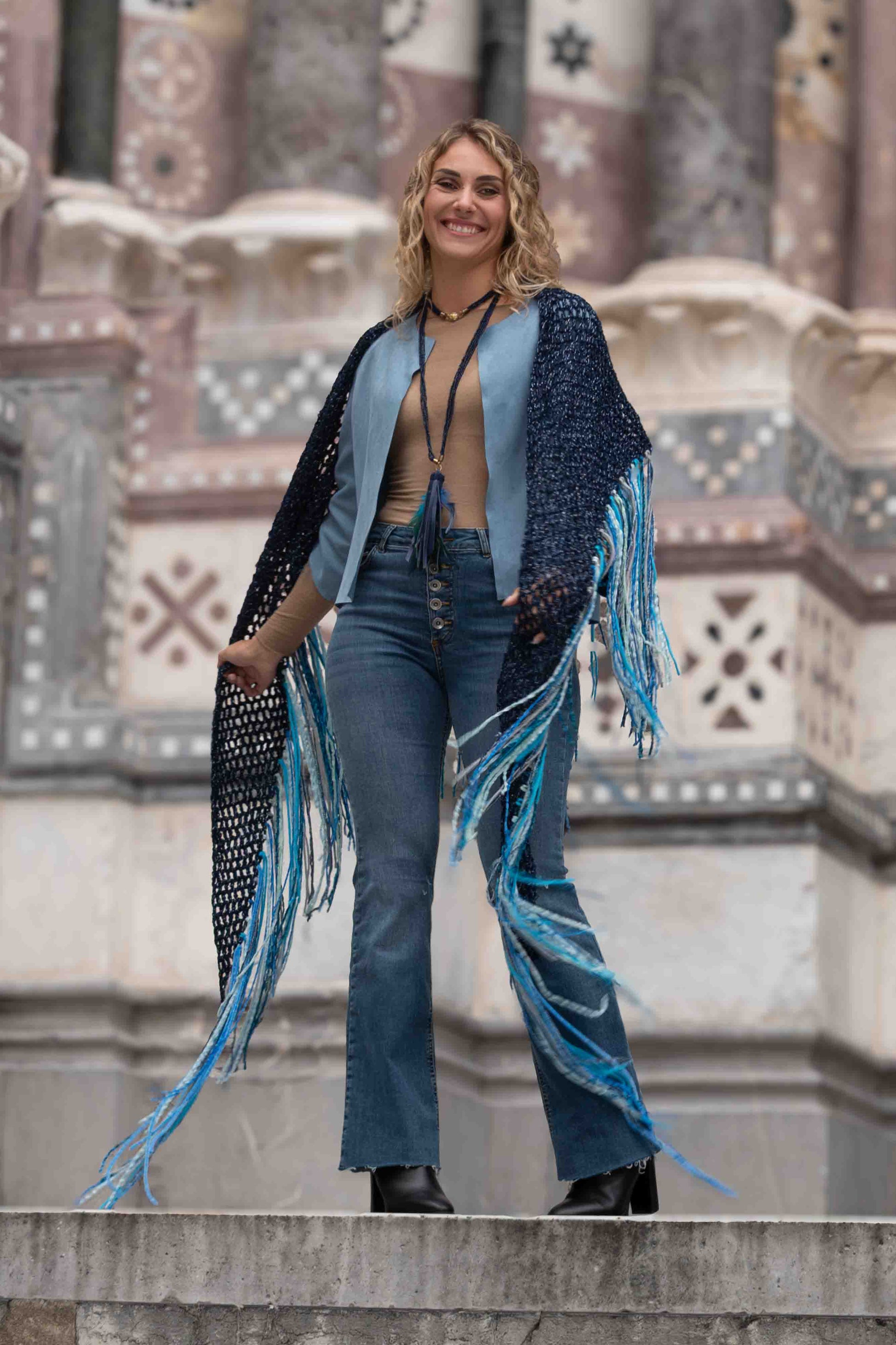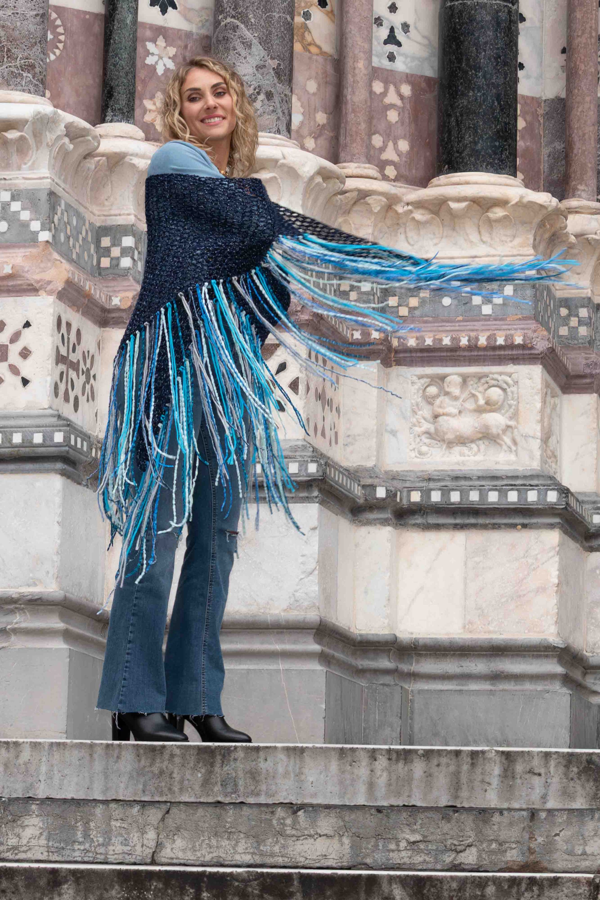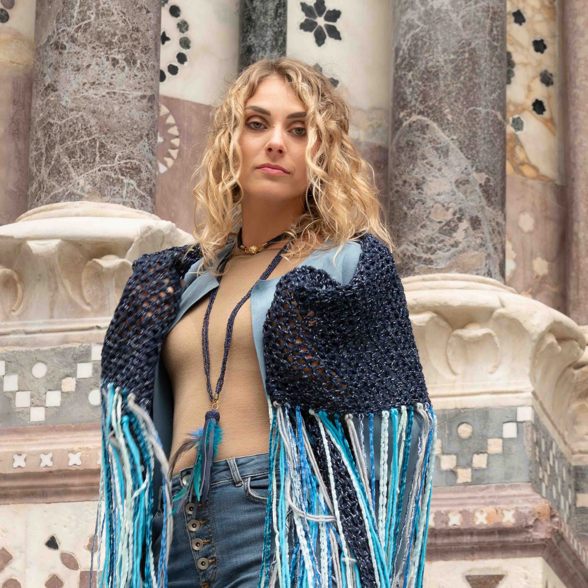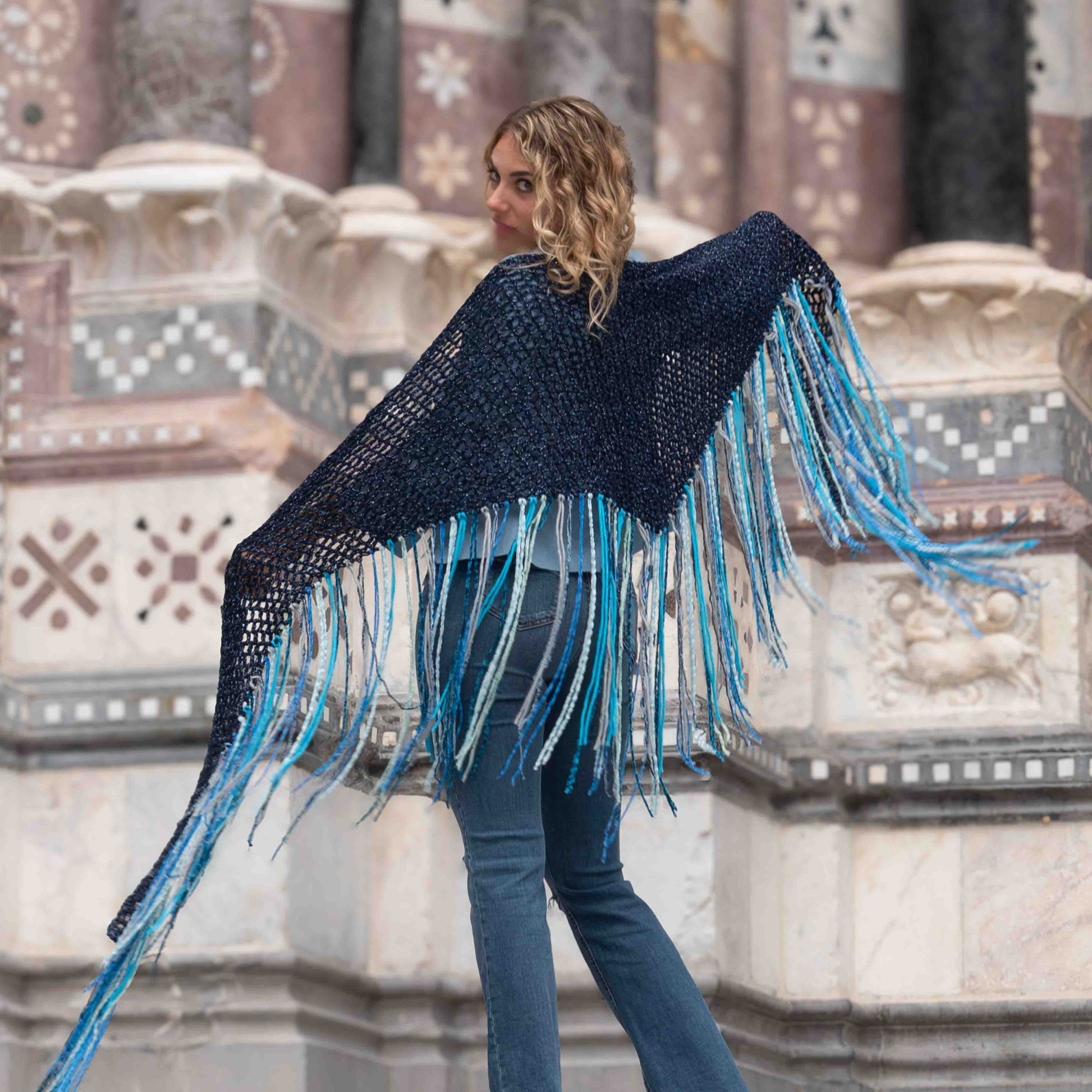 Grande scialle in ciniglia, lana e lurex blu lavorato a crochet con lunghe frange sui toni dell'azzurro e blu, Pezzo unico artigianale fatto a mano.