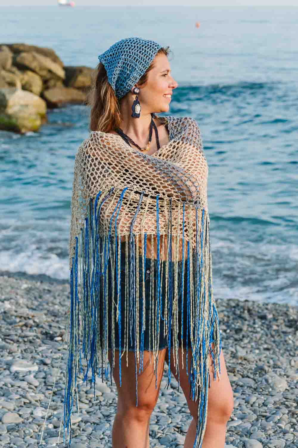 Beige/denim linen and lurex yarn shawl, crocheted, with long chenille fringes. Unique item, handmade.